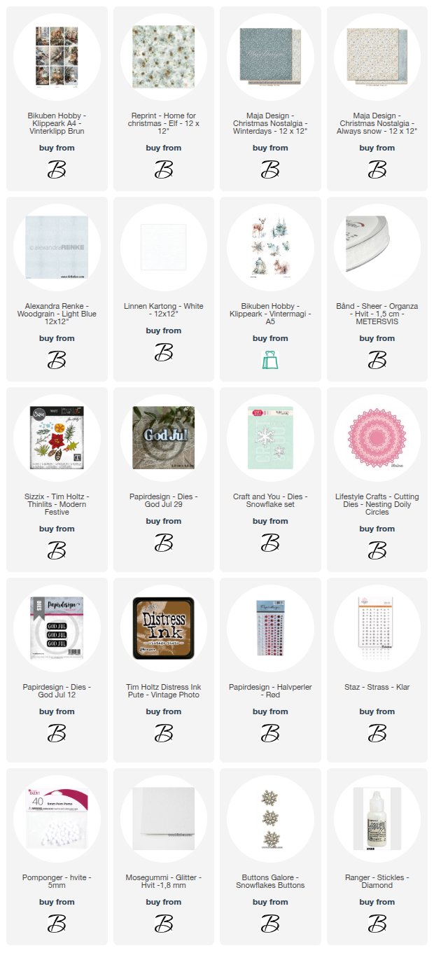 Diesen "Nesting doilie circles" er brukt bak motivet. Matchende ark fra Maja Design, snøfnugg og stickles på detaljene gir en flott helhet og finish.